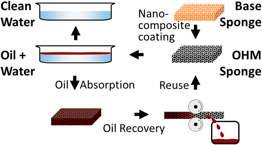 Com o objetivo de criar uma alternativa mais económica e amiga do ambiente, uma equipa de investigadores da Universidade Northwestern, nos EUA, desenvolveu uma esponja altamente porosa que absorve de forma seletiva o petróleo da água. A junção de uma nanoestrutura magnética com uma estrutura de carbono permitiu criar um nanocompósito oleofílico, hidrofóbico e magnético (OHM). No estudo em causa, foi utilizado para revestir uma esponja, denominada então por esponja OHM.