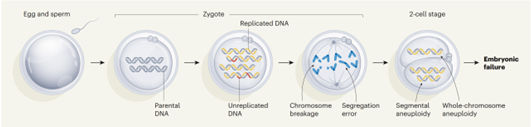 Antes do zigoto se dividir em duas células, o DNA parental derivado do óvulo e do espermatozóide devem ser duplicados através da replicação do DNA. Palmerola et al. relatam que, em zigotos humanos, a replicação do DNA é lenta e errática (um fenómeno conhecido como stress de replicação) e às vezes não é concluído antes da divisão celular. O stress da replicação consiste, então, na desaceleração ou paralisação de estruturas chamadas de garfos da replicação que se formam quando as duas cadeias de DNA se desenrolam para permitir a replicação, e que se movem ao longo da fita à medida que a replicação prossegue. A replicação incompleta do DNA leva a quebras no cromossoma, e também pode causar erros durante a segregação dos cromossomas duplicados para as células filhas. Estes defeitos causam respetivamente fenómenos denominados por aneuploidia segmentar (em que partes dos cromossomas estão em falta do embrião de 2 células) e aneuploidia do cromossoma inteiro (em que todos os cromossomas estão a faltar). As aneuploidias podem levar à falência embrionária.