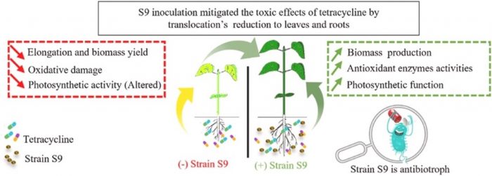 Os investigadores já sabiam do impacto negativo que a TET radicular causa nas folhas, na elongação do caule e na biomassa em geral, pelo stress oxidativo gerado e dificuldade fotossintética. Tais falhas foram recuperadas com a inoculação com a estirpe S9, que reduziu os efeitos tóxicos da TET, pela redução da translocação da toxina ao longo das folhas, que melhorou a transpiração e, por conseguinte, a função fotossintética e produção de biomassa. A grande vantagem de ter bactérias antibiotróficas, em vez de simplesmente resistentes, é que a expressão dos genes associados e a produção dessas proteínas não requer a multiplicação da bactéria, o que não leva ao seu crescimento descontrolado.